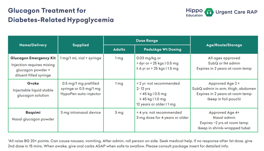 Glucagon (released by the pancreas) triggers glycogen release from the liver to raise blood sugar, but it only works if glycogen stores are intact. Always follow up with food once the patient is stable to replenish these glycogen stores. Expect a 50–100 point rise in blood glucose within 30 minutes. A second dose may be given after 15 minutes if there’s no response. There is risk of nausea or vomiting, so be sure to maintain a patent airway. See the chart below for available forms: